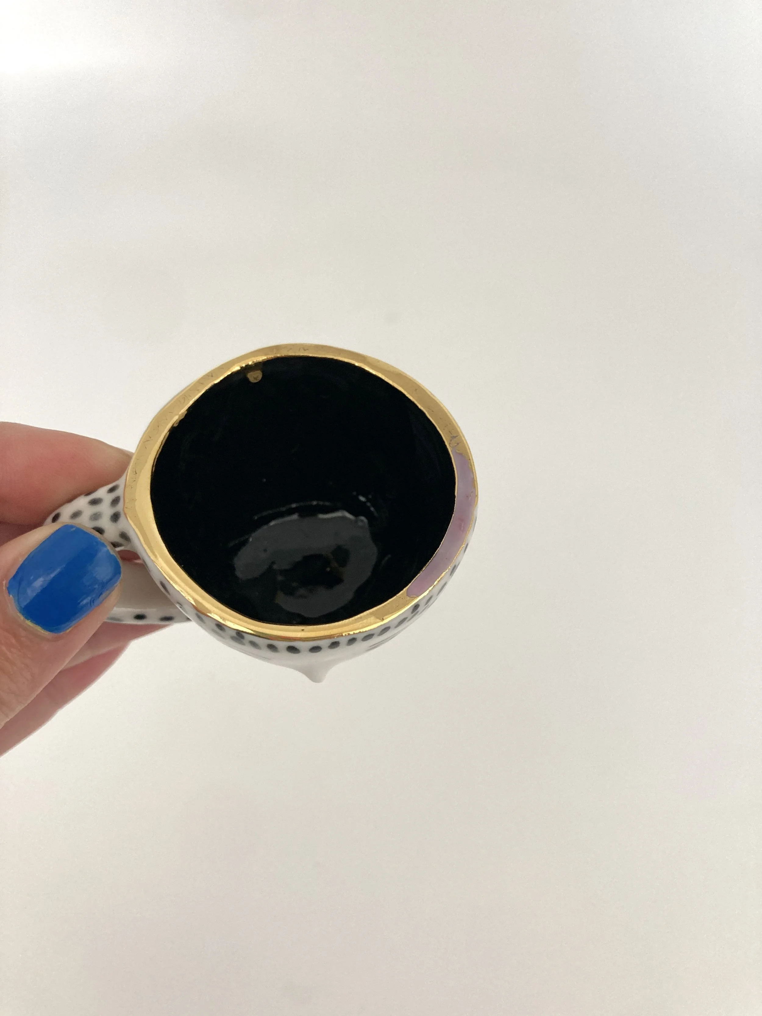 Hand built porcelain espresso cups with sculpted nose.