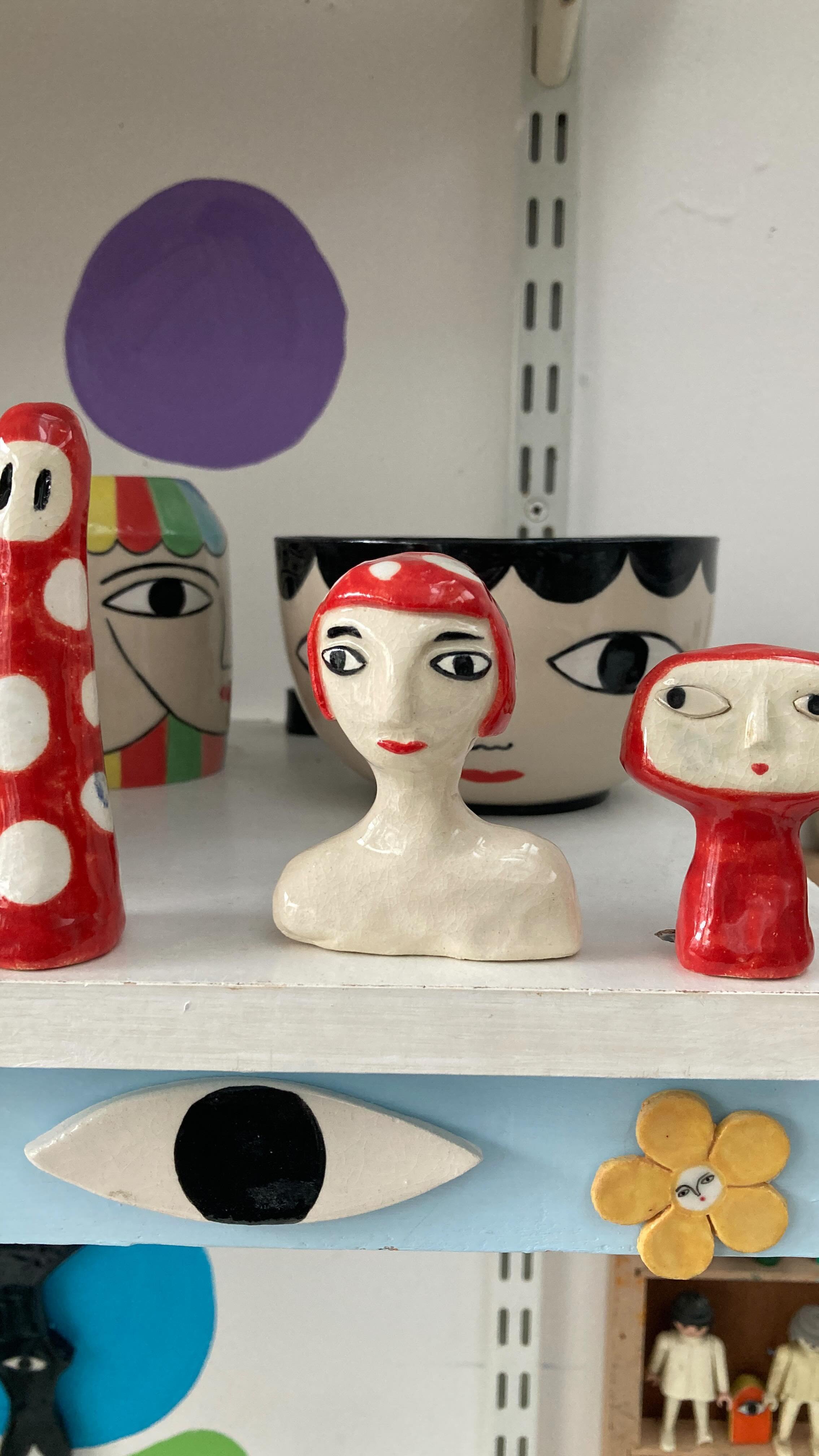Kinska is an East London based artist with a unique and eye-catching style that travels fluidly through the worlds of ceramics, illustration, and storytelling. Striking and joyful, her work is the result of introspection and personal insights into emotions and feelings, a dip into the soulful world that exists in her mind. With playful and immersive energy, she draws us into a pareidolic universe where everyday objects have their own life. Born in Argentina she began her creative life as a fashion designer working for womenswear for several years. In 2009 when she moved to London, she encountered clay.